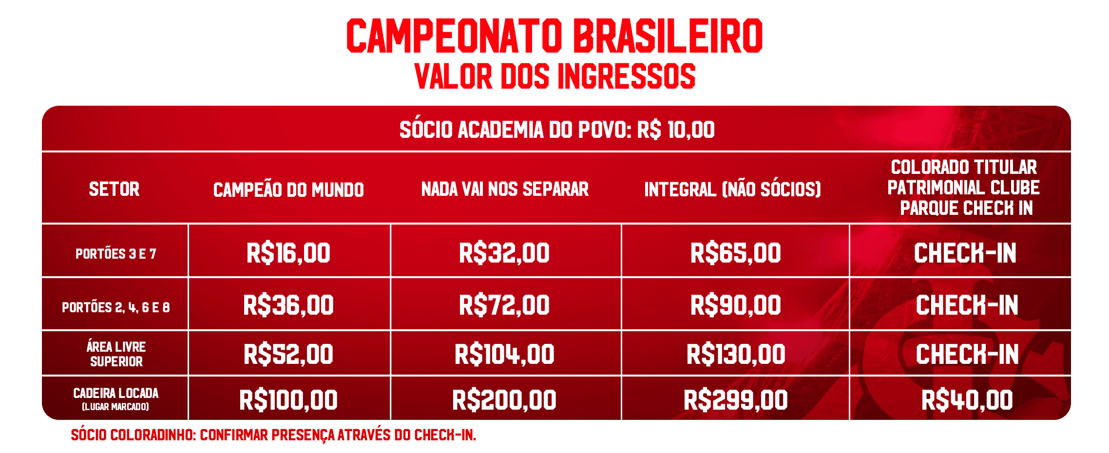 A estratégia de precificação para 2026 prevê valores acessíveis em todo o Beira-Rio, tanto para associados(as) quanto para não sócios(as). Os(as) sócios(as) Campeão do Mundo e Nada Vai Nos Separar terão descontos ampliados durante o Gauchão, de 80% e 40%, respectivamente, acima do padrão habitual que é de 60% e 20%, Já o(a) Sócio(a) Academia do Povo poderá adquirir ingresso para qualquer setor de área livre do estádio pelo valor fixo de 10 reais.
